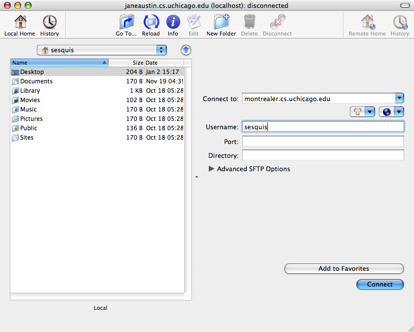 Under the "Connect to:" field, you should fill in the name of CS computer you would like to connect to. The CS Dept provides a list of machines you can connect to here (explicit). Some convenient names are the-400.cs.uchicago.edu, montrealer.cs.uchicago.edu and sail.cs.uchicago.edu. Fill in Username with the name of your CS account (usually your CNETID), and leave port and directory blank. Hit connect, and you'll be prompted for your password. Enter this, and you'll see Fugu change to this: