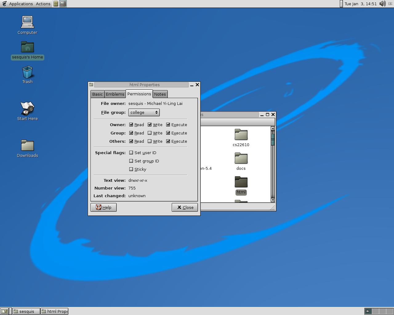 You can see "sesquis's Home" icon that I clicked to open a graphical file manager. This lists files and folders in your default user directory. If you'll note, I already have a "html" directory in the bottom right of the file manager.