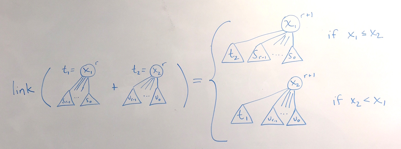 A binomial tree of rank r + 1 is formed by linking together two trees of rank r, making one the leftmost child of the other.