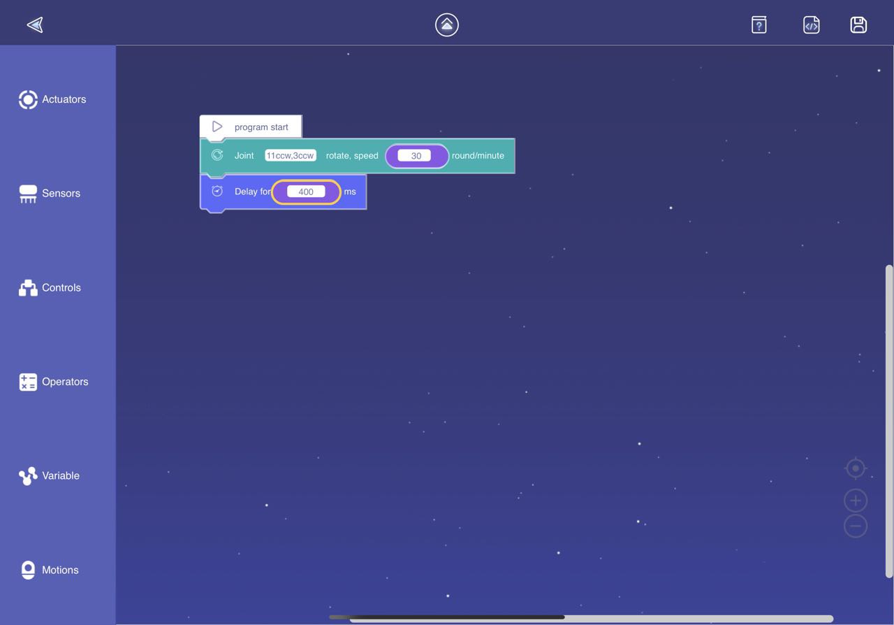 Once you have determined the joints and their rotation direction, the next step is to specify the rotation speed for those joints. To achieve this, you will need to drag the text input block from the "Operators" menu and attach it to the empty space within the previous block. Set the speed to 30 round/minute. Next, add a delay block to the program and set the delay duration to 400 milliseconds.