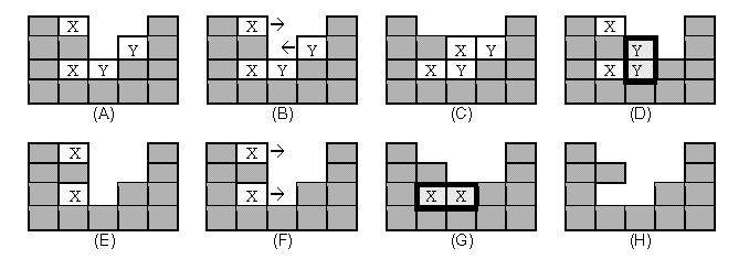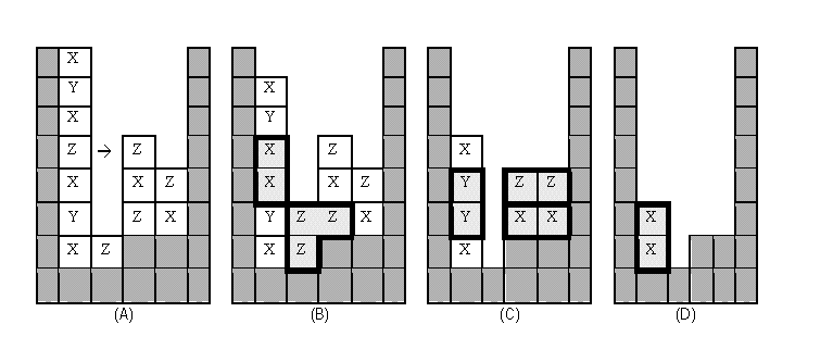 The game Vexed is a Tetris-like game created by James McCombe. The game consists of a board and blocks that are arranged in stacks. If the space to the immediate left or right of a block is open (this is, it contains no other blocks nor any part of the game board "wall"), then that block can be moved in that direction. Only blocks that are not part of the game board wall can be moved; "wall" blocks are stationary in all events. After a block is moved, if it or any other block no longer has anything under it, those blocks fall until they land on another block. After all of the blocks have landed, if any two or more identically marked pieces are in contact horizontally and/or vertically, then those blocks are removed as a group. If multiple groups result, then all groups are removed simultaneously. After all such groups are removed, all blocks again fall to resting positions (again, wall blocks do not move). This might then result in more groups be removed, more blocks falling, and so on, until a stable state is reached.