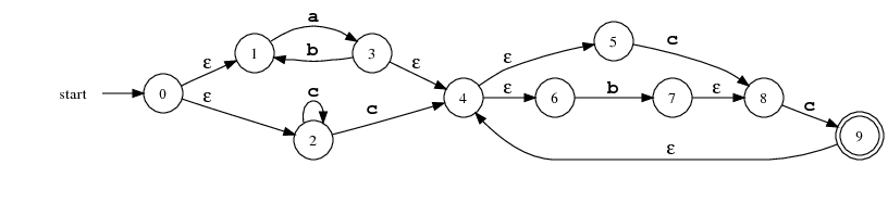 (Unlike Problem 1(c), this RE accepts leading zeros.) Draw a non-deterministic finite automata (NFA) that accepts the same language as the above RE.(-|ε) (0|1)+ (.(0|1)+)? (E(+|-|ε)(0|1)+)? - Consider the following NFA over the alphabet {a,b,c}: