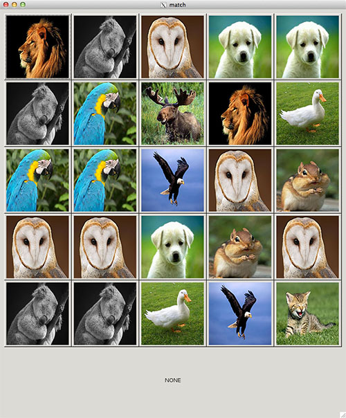- Create a 5x5 grid of buttons that will display images of various animals. Each button, will display a picture of an animal from a randomly generated integer. The following list maps a random integer to the animal that will need to be displayed: