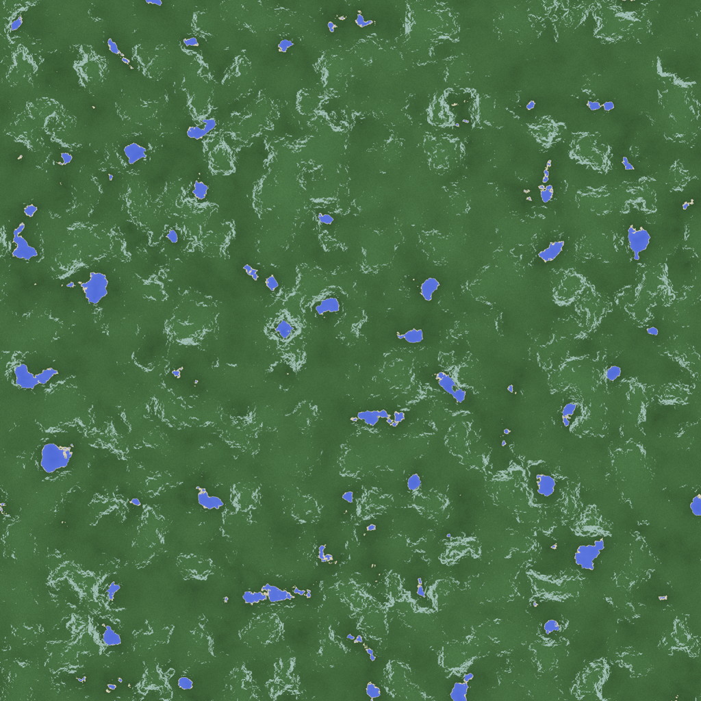 This is fairly rough synthetic terrain that has many small lakes. It has been divided into four cells and has five levels of detail. Here is a reduced version of its colormap