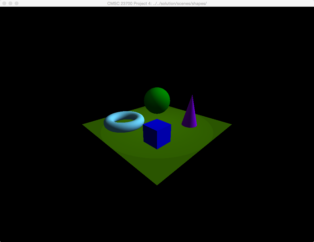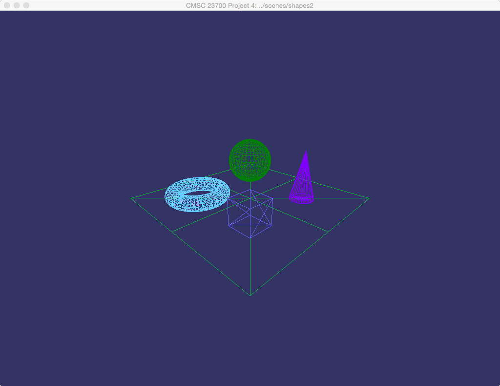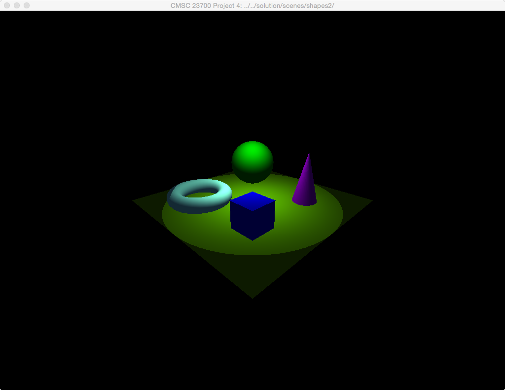 Here are screen shots for the sample scenes. We have included a view that shows the light-volume cones as a wire frame. This view is not something that you need to implement; rather, we include it to help you understand the geometry of the scenes. Click on the thumbnail to get the full image.