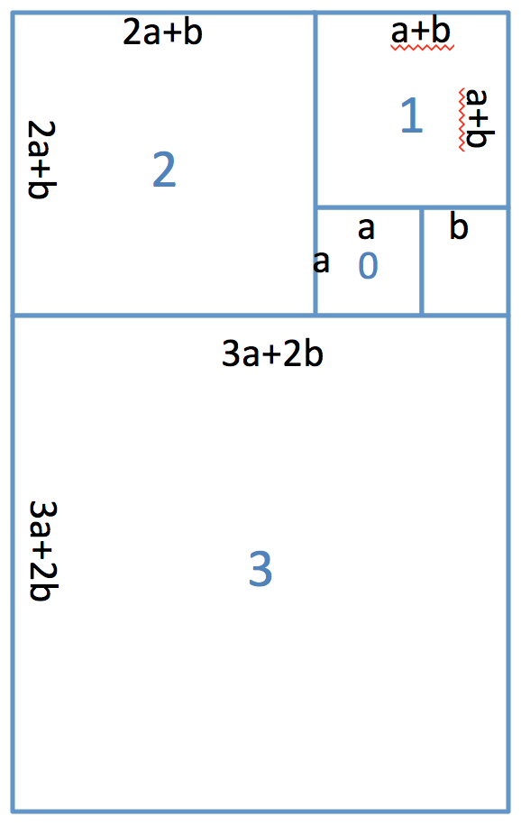 You are going to write a more generalized version of this process. Instead of requiring that a/b = 1.618, you are going to allow any arbitrary starting value for a and b. You will then calculate the dimensions of the subsequent squares that would be added on to create a structure like that in the pictures. Below is an image that illustrates the process for 3 squares.