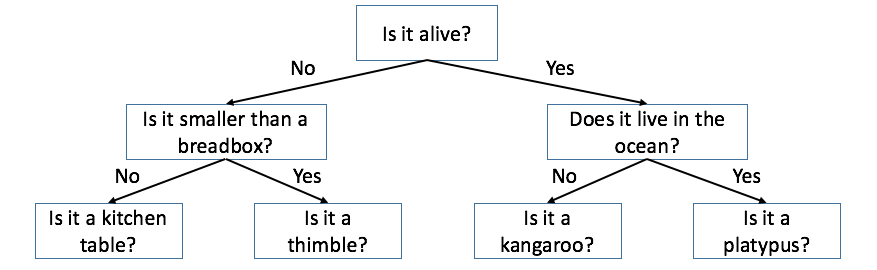 You can see that for this game, the computer would first ask if what you are thinking of ("it") is alive. If it is alive, it will ask if it lives in the ocean. If not, then it will guess a kangaroo. If so, then it will guess a platypus. Quick question - if the computer has a chance to ask 20 questions before guessing, how many different items can it guess?![]()