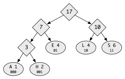 Running this algorithm on our example (SHESELLSSEASHELLS) produces the following tree: