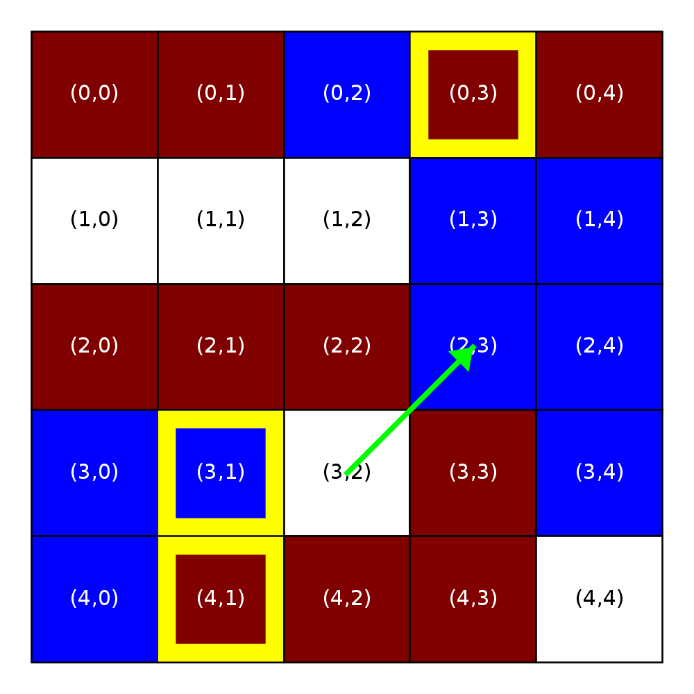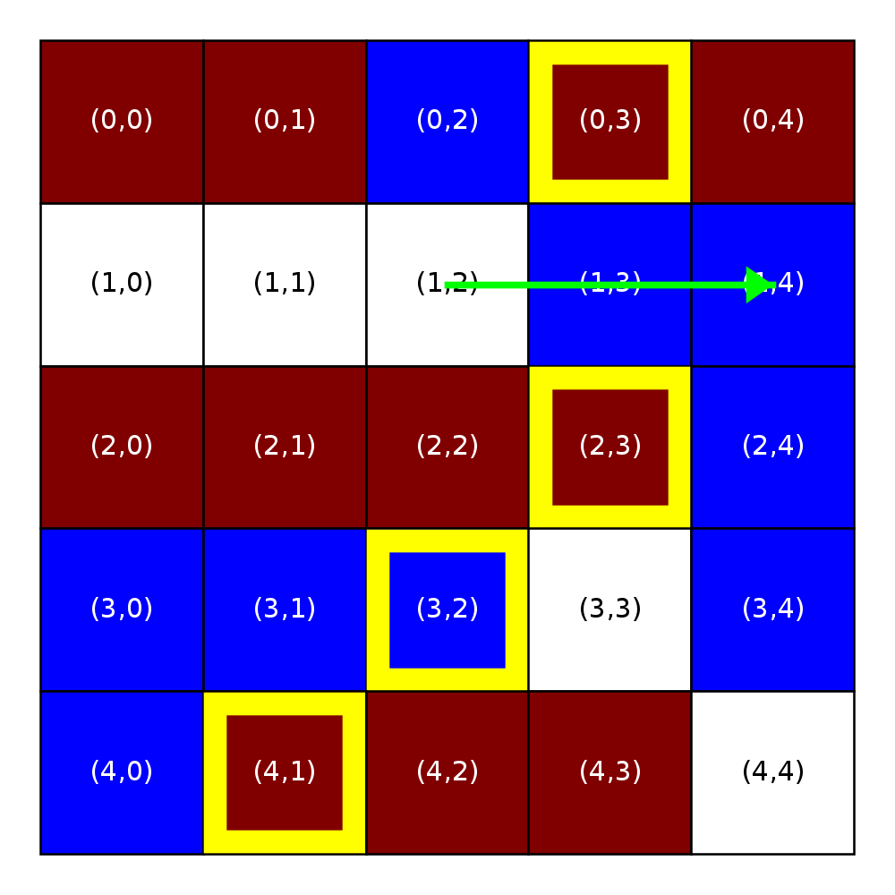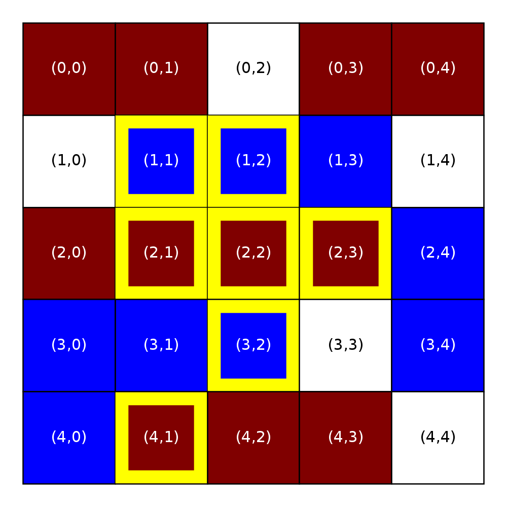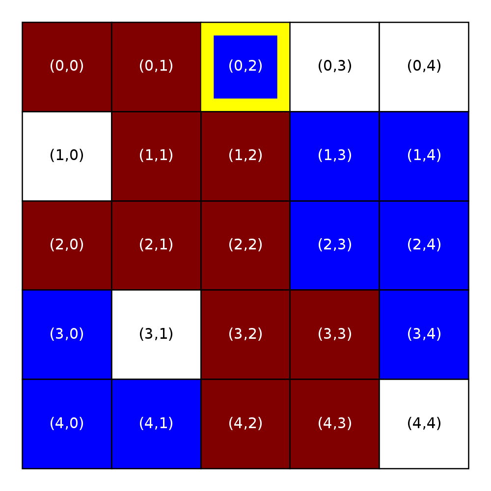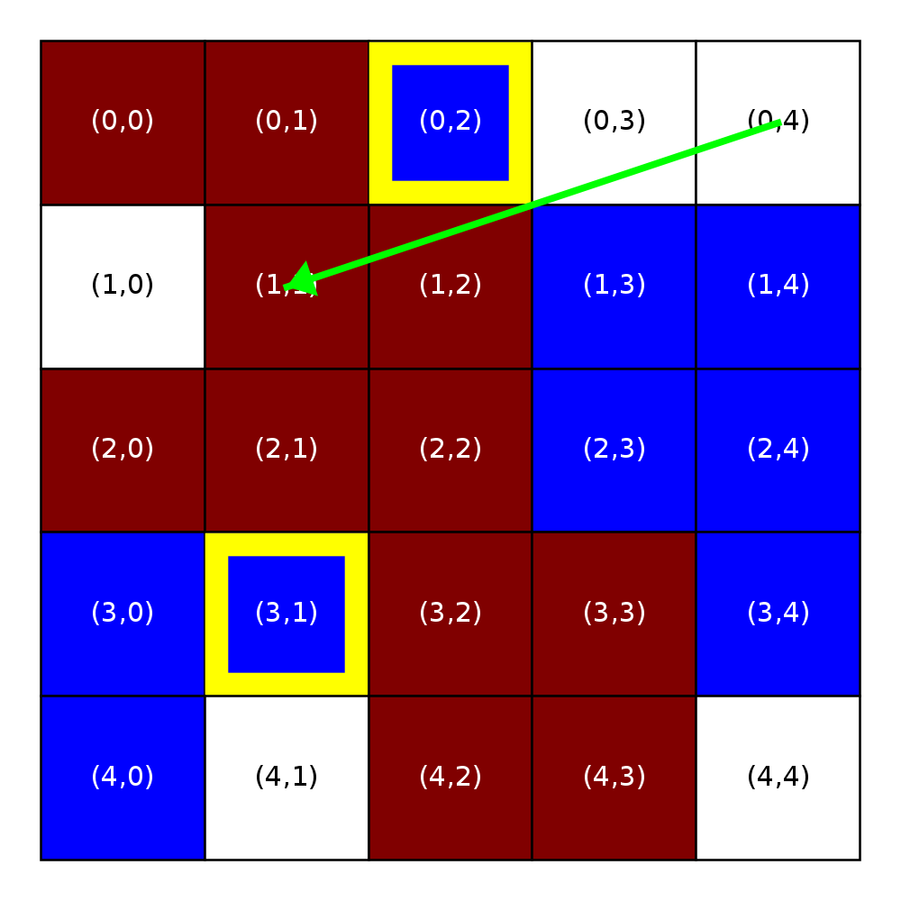 Here is an example relocation of the unsatisfied homeowner at Location (1,1) to Location (0,2). On the left, we show a city with R-1 neighborhoods in which the similarity threshold is 0.44 and the occupancy threshold is 0.5. Below the grid, we also include a depiction of the locations that are open in the neighborhood.