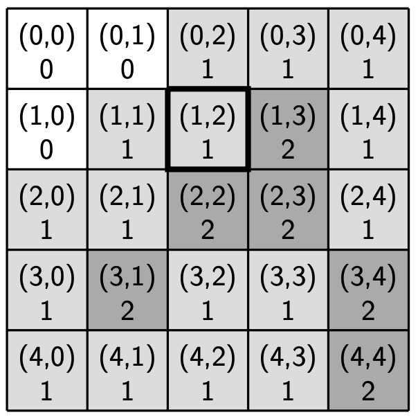 For example, say our sample region has a community center at location (1, 2) with service distance 1. The community center is shown above with a bold outline and its R-1 neighborhood is shaded in yellow. The SL-speaking homes at locations (0, 2), (0, 3), (1, 1), (1, 2), (1, 3), (2, 2) and (2, 3) are within the service distance of the community center, while those farther away are not. Again, community centers do not service DL-speaking homes.