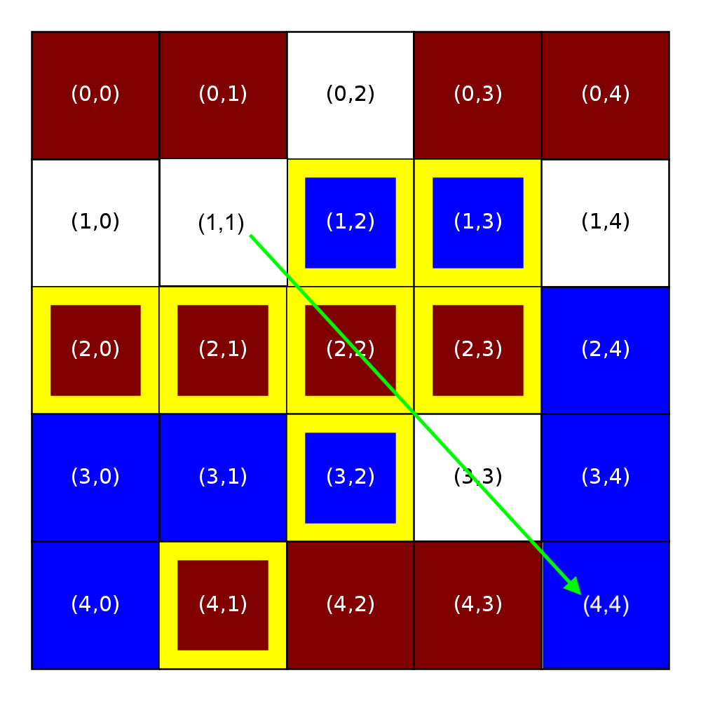 The frame on the right shows the state of the empty list after this relocation. Notice that location (4,4) has been removed from the list of open locations and location (1,1) has been added to the end of the list. The blue owner is now at location (4,4). With this move, other neighboring homewoners may become unsatisfied, even the blue neighbor may not be satisfied with this move; however, we will not recalculate satisfaction until the next simulation step.