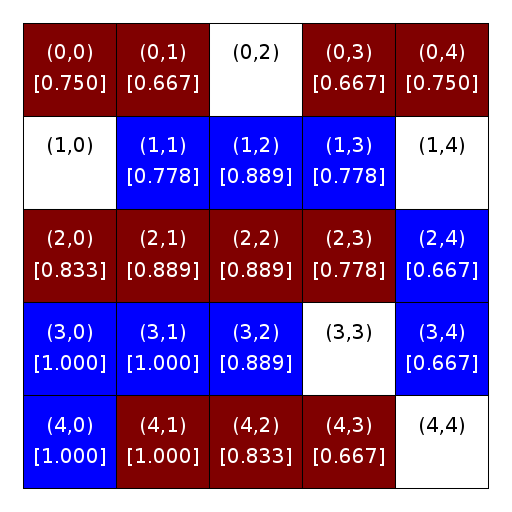 The figures below illustrate this concept using a city with R-1 neighborhoods. They show homeowners and their similarity scores (on the left figure) and their occupancy scores (on the right figure). White cells depict unoccupied homes/locations. Cells that are maroon (dark red) contain maroon homeowners. Cells that are blue contain blue homeowners. Each grid cell contains its location (in parentheses) and, for occupied homes, the homeowner’s R-1 similarity or occupancy score (in square brackets). We rounded the scores in the figures to three digits merely for clarity. Do not round them in your computation.