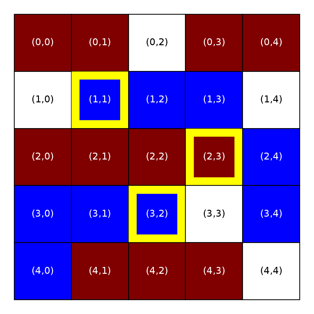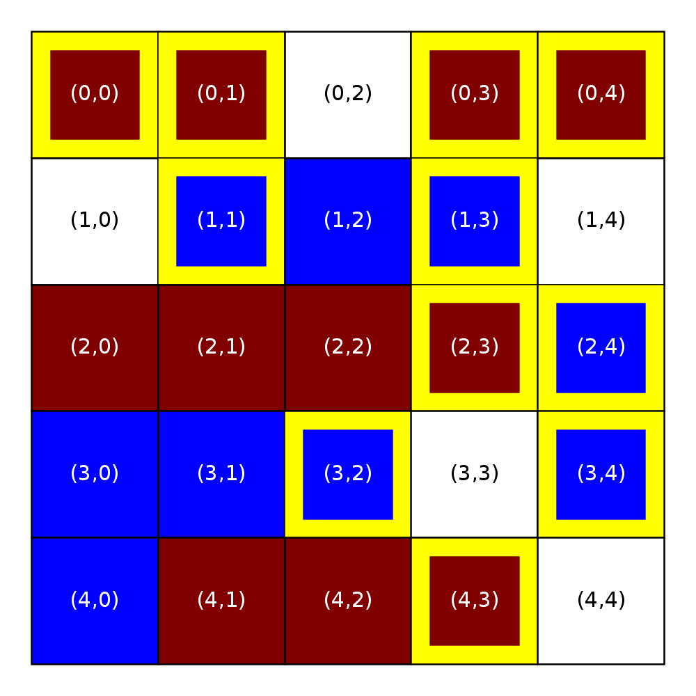 In this and in nearly all subsequent city depictions, a white cell indicates a home that is for sale (i.e., unoccupied home), a maroon (dark red) cell indicates that a home is occupied by a maroon homeowner, and a blue cell indicates a home that is occupied by a blue homeowner. This figure also includes the location (in parentheses) of each home (cell) to help orient you in the city.
