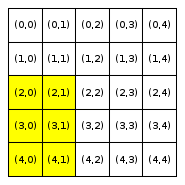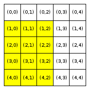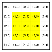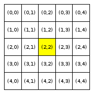We will refer to a neighborhood with parameter R=x as an “R-x neighborhood”. The following figure shows the neighborhoods around Locations (2,2) and (3,0) for different values of R. Cells colored yellow are included in the specified neighborhood.
